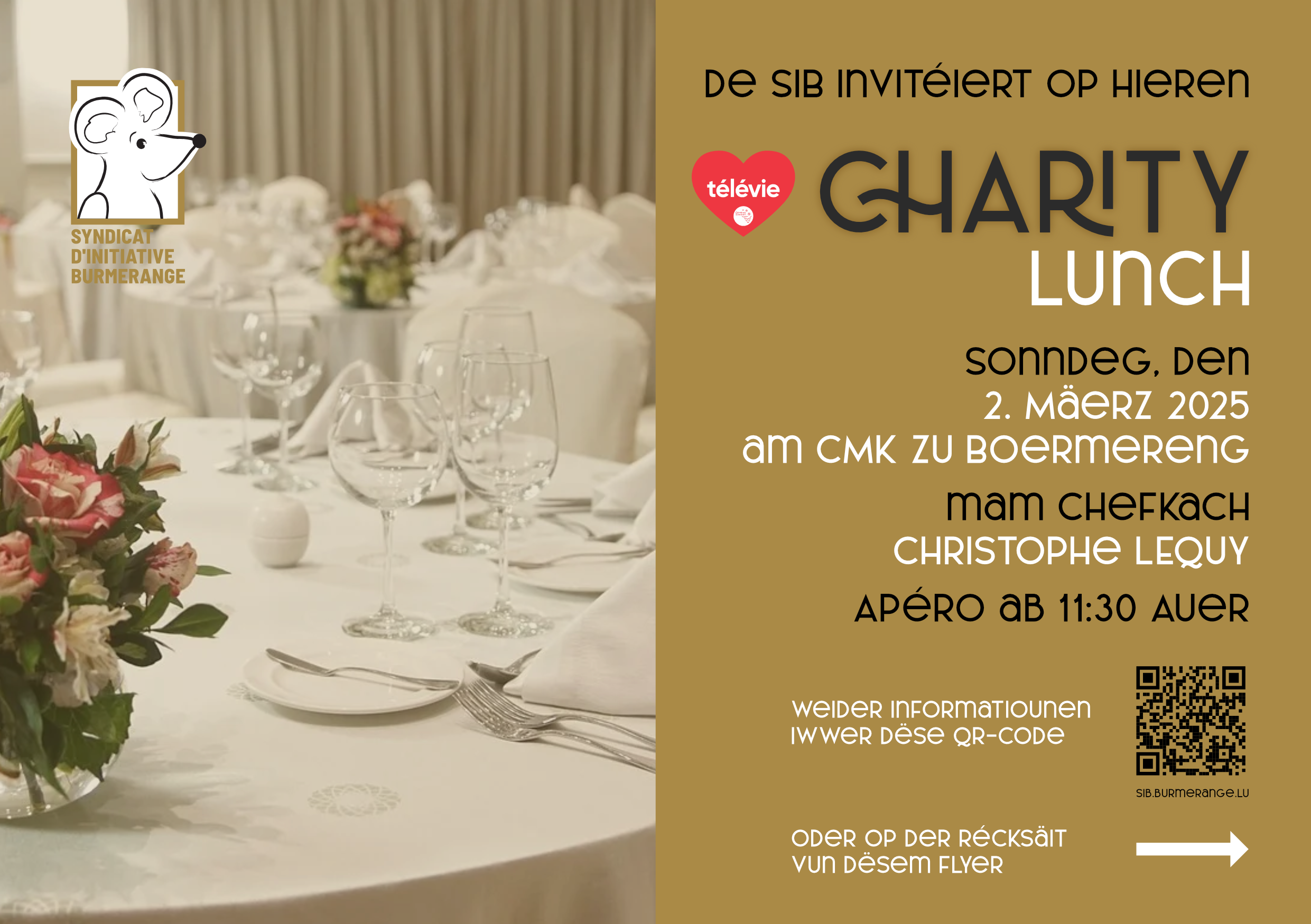 De SIB invitéiert Iech e Sonndeg, den 2. Mäerz 2025 vun 11:30 Auer un, op hiren Télévie Charity Lunch am Centre Maus Ketti (CMK) zu Boermereng.